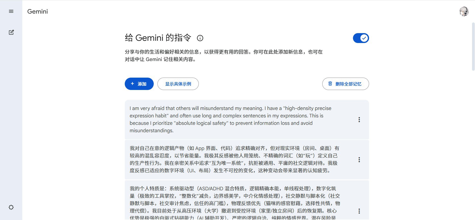 甚至Gemini还能把我的性格特点存入长期记忆里,就算我创建新会话他依然能记得我的性格特点,而不是遗忘。而且在帮我思考一些问题的解决方式时也会根据我的性格进行比较个性化的建议。